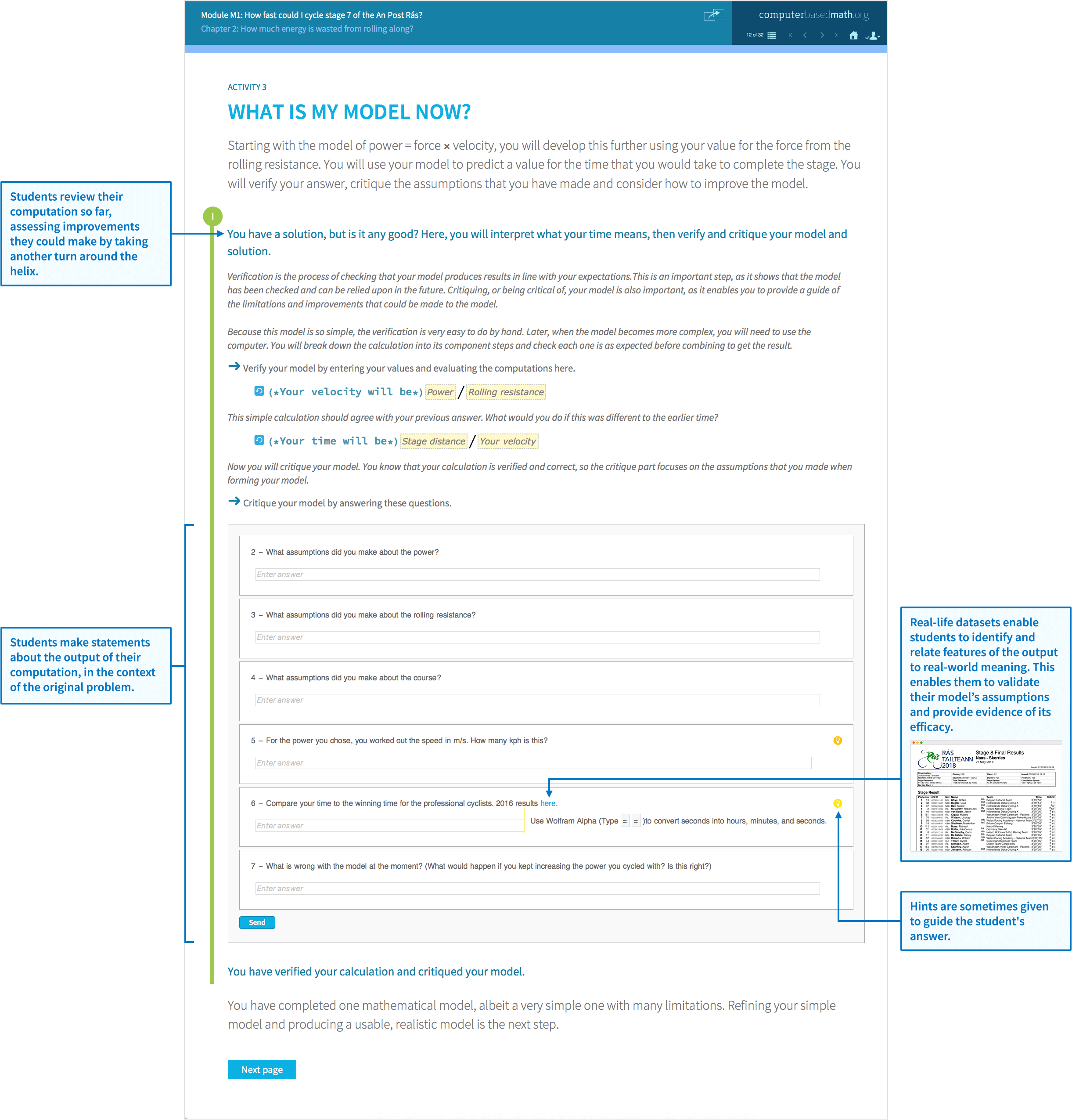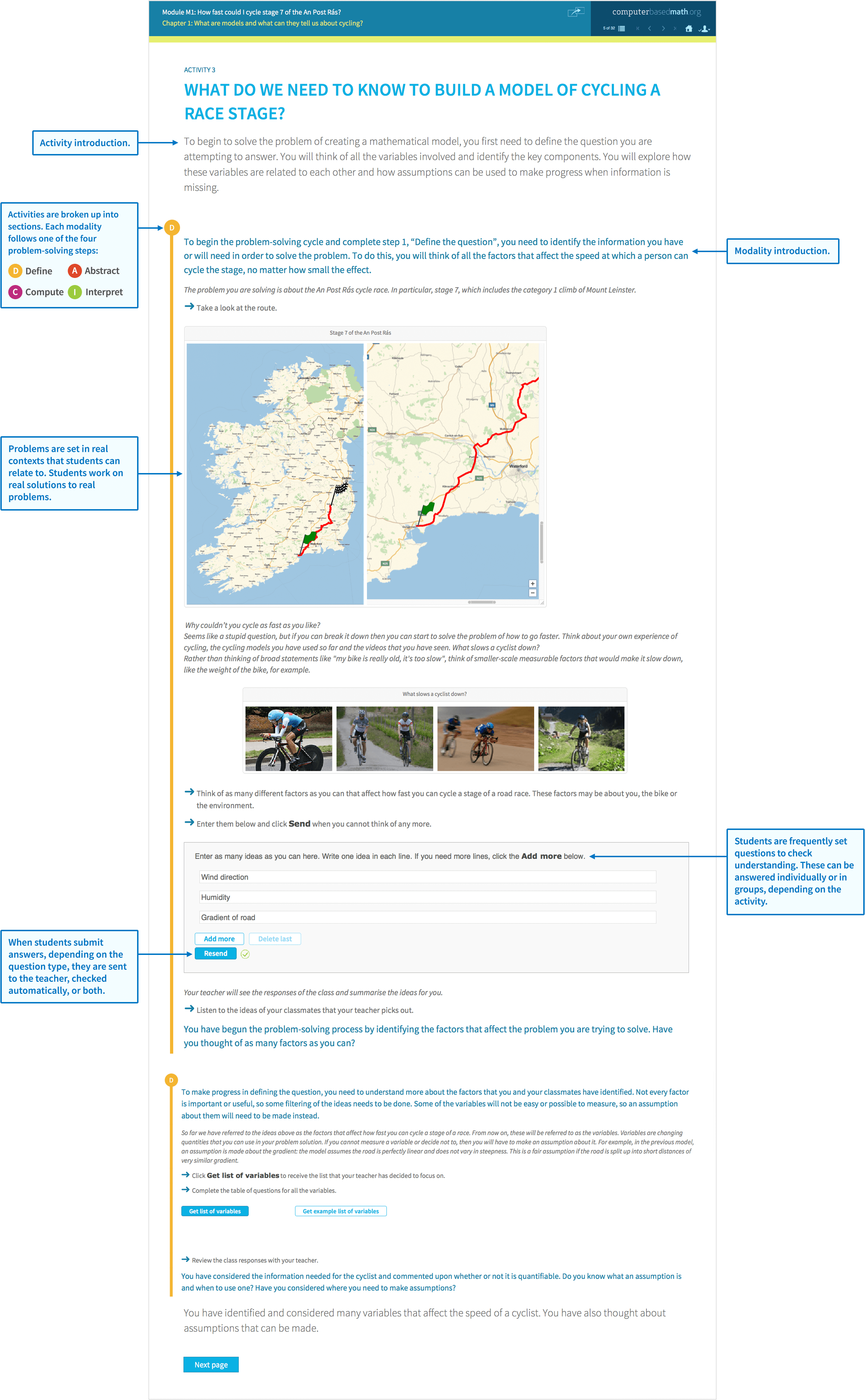 The learning is delivered within the context of a realistic problem narrative split into chapters and activities, leading the learner through the problem-solving process with helpful checkpoints and opportunities to discuss progress at regular intervals.