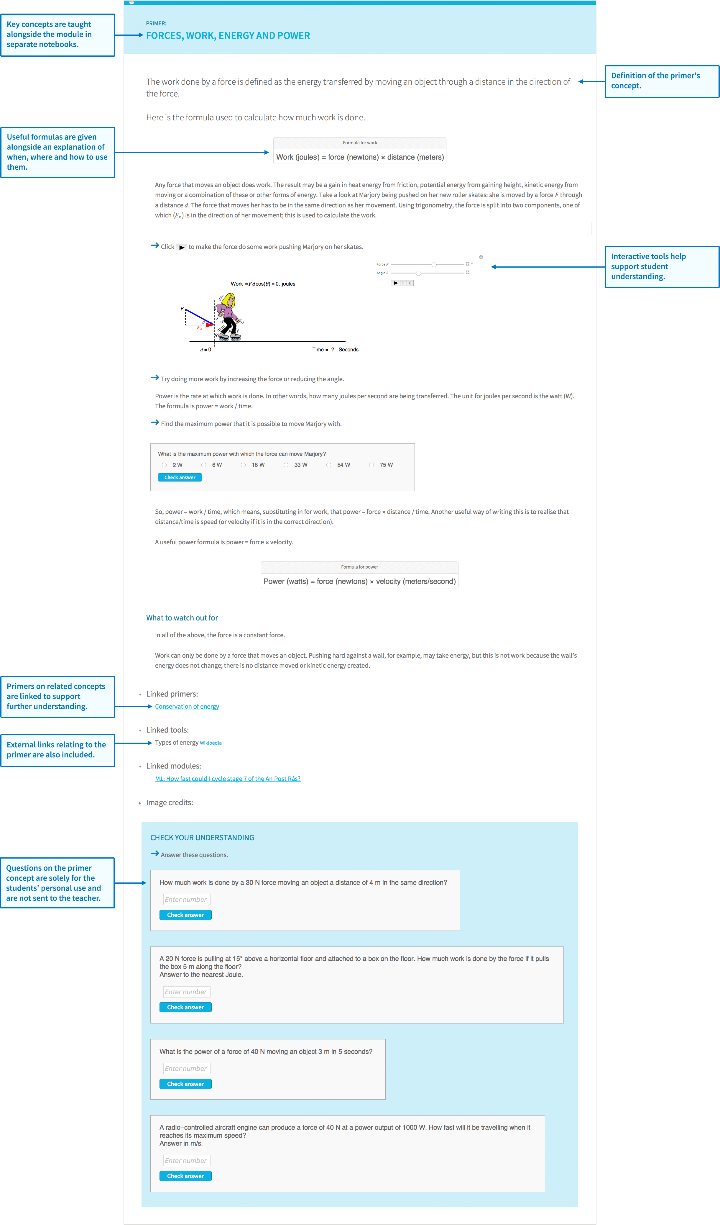Primers are out-of-context descriptions of concepts that are useful within a module, similar to current curricular resources. Different problem-solving narratives may link to the same primer as necessary.